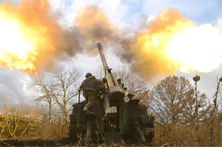 Расчет самоходной артиллерийской установки (САУ) Вооруженных сил России ведет огонь по позициям Вооруженных сил Украины (ВСУ), Харьковская